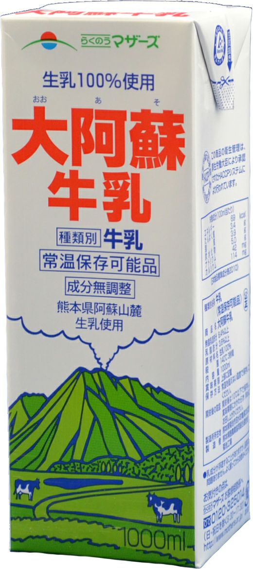 太陽と緑にめぐまれた酪農地帯「熊本」。 その豊かな自然の中で育まれた乳牛からまごころ込めて搾った生乳をパック詰めしたロングライフの成分無調整牛乳。 容量 1000ml 製造者 熊本県酪農業協同組合連合会 種別 牛乳(常温保存可能品) 成分 無脂乳固形分 8.4%以上、乳脂肪分 3.6%以上 アレルギー 乳成分 エネルギー 69kcal(100gあたり) 原材料 生乳100%(熊本県産)